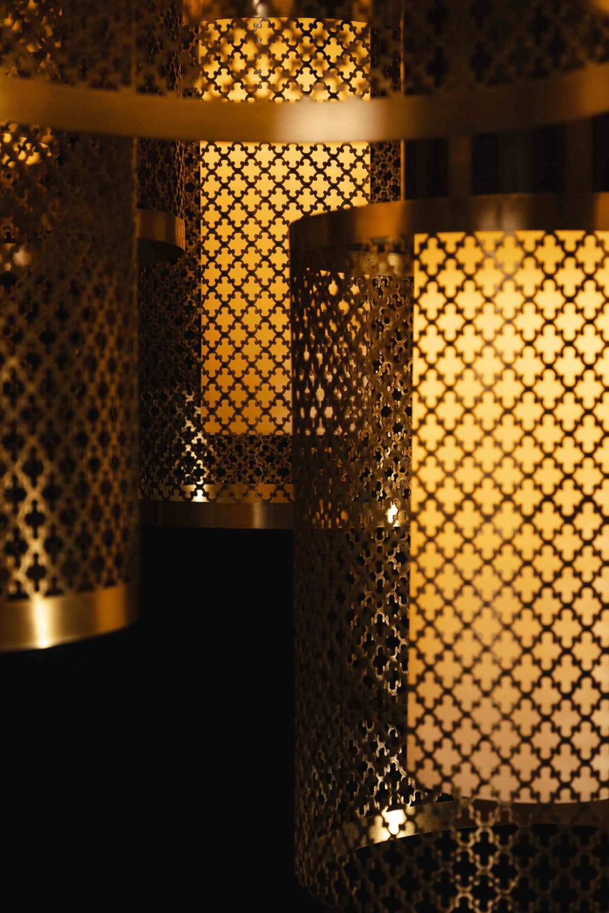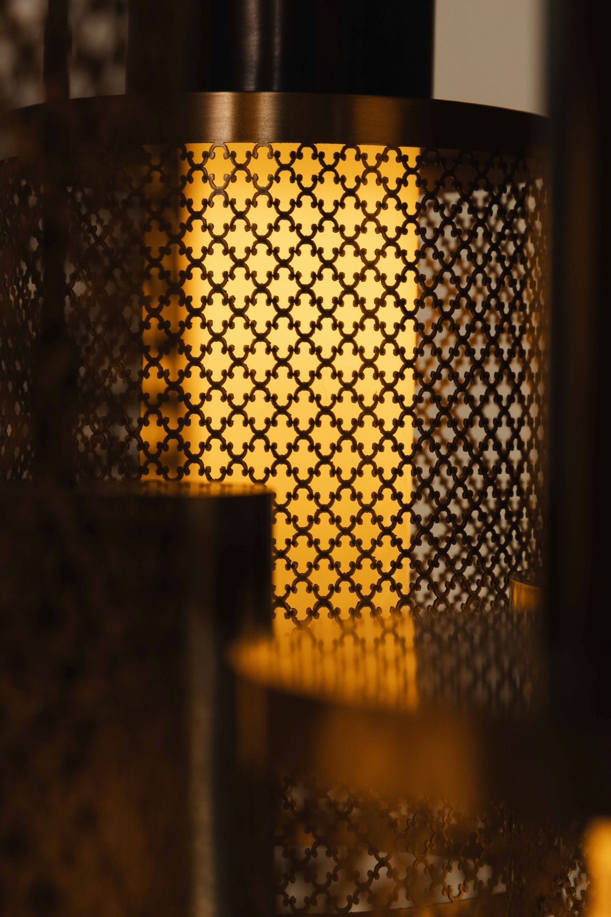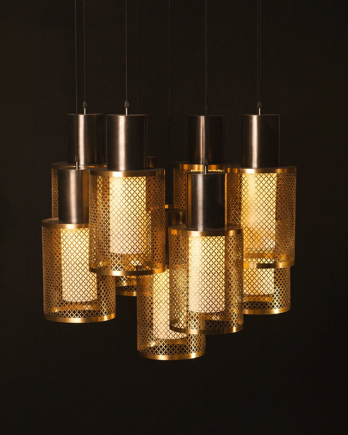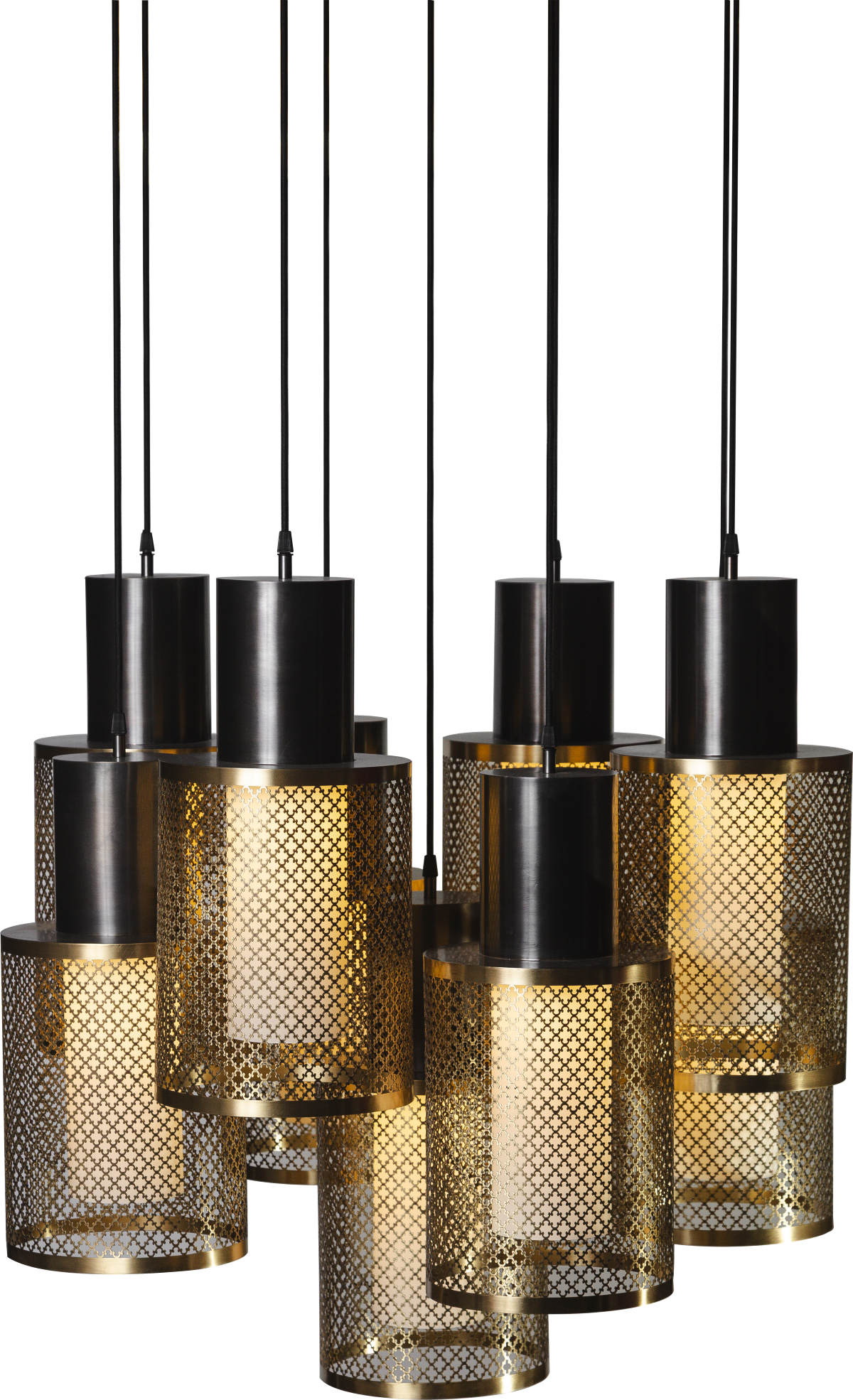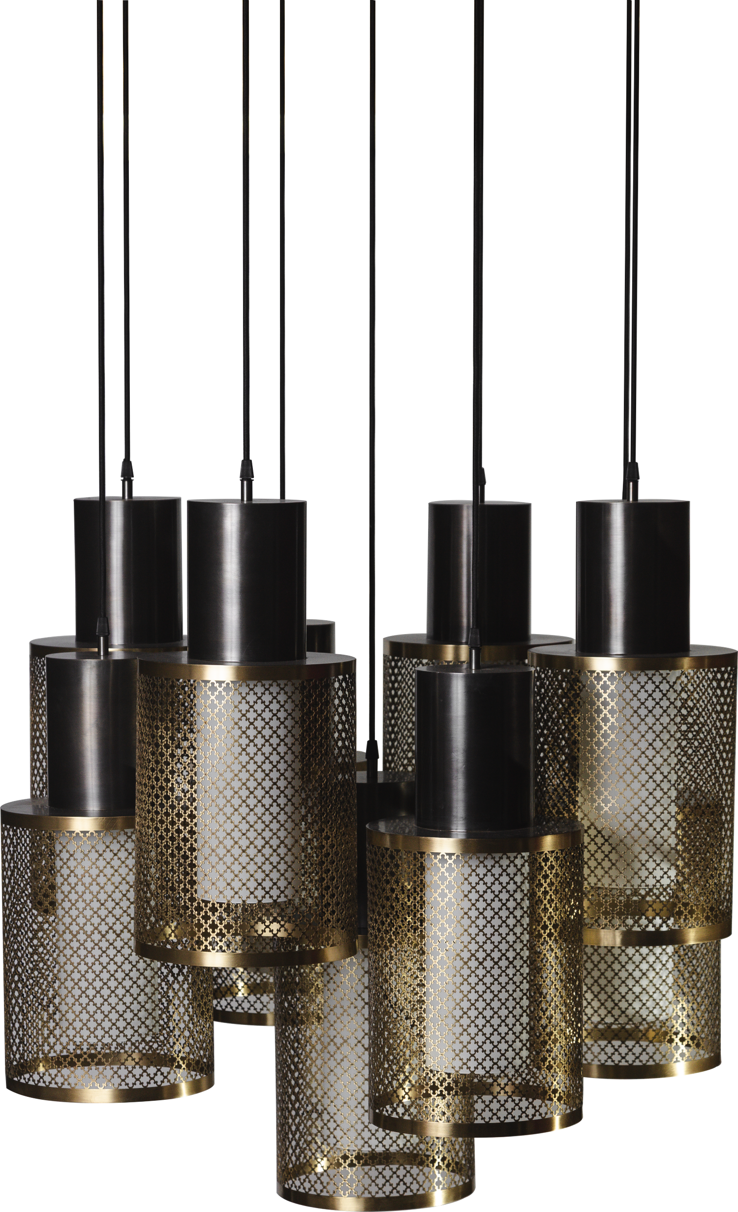 9 suspensions en Laiton gravé or vieilli et laiton patiné canon de fusil, verres opaques.