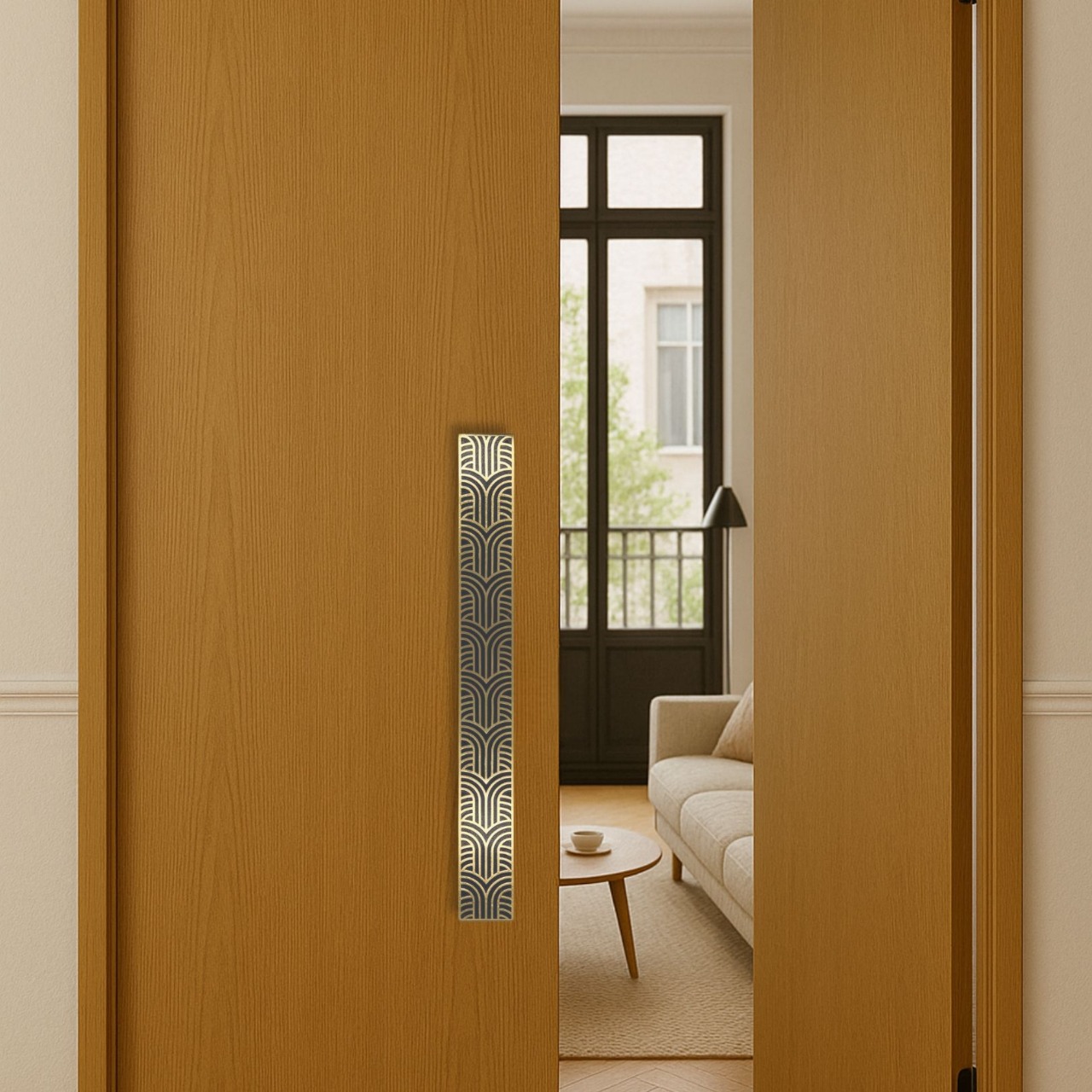 La poignée de tirage art déco en laiton massif mesure 30 cm de long pour 3 cm de large. Elle s’adapte aussi bien aux portes qu’aux meubles, buffets, colonnes ou panneaux décoratifs. Son motif gravé en éventails traduit la géométrie et la précision caractéristiques des années 1930, apportant rythme et équilibre à la surface. Compacte mais expressive, elle offre une présence décorative raffinée et structurante.