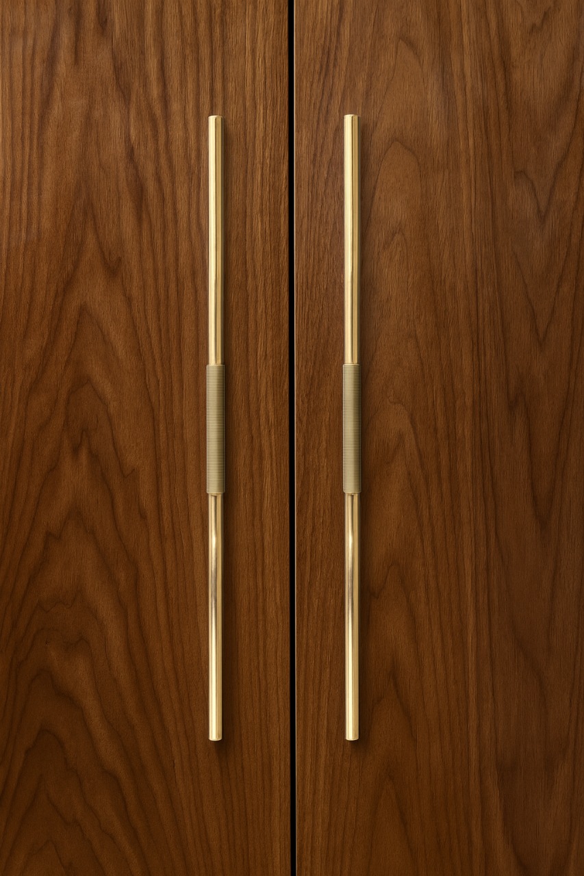 La poignée de tirage en fils de laiton présente une silhouette longue et élancée qui s’intègre facilement aux portes et façades de mobilier. Son dessin repose sur un tube principal dont les lignes droites et régulières expriment une esthétique sobre. Au centre, une zone texturée marque une transition visuelle : les fils de laiton y sont enroulés de manière serrée et continue, créant une surface rythmée qui contraste avec la partie lisse du corps principal. Cette alternance renforce la présence graphique de la poignée tout en conservant une expression discrète.