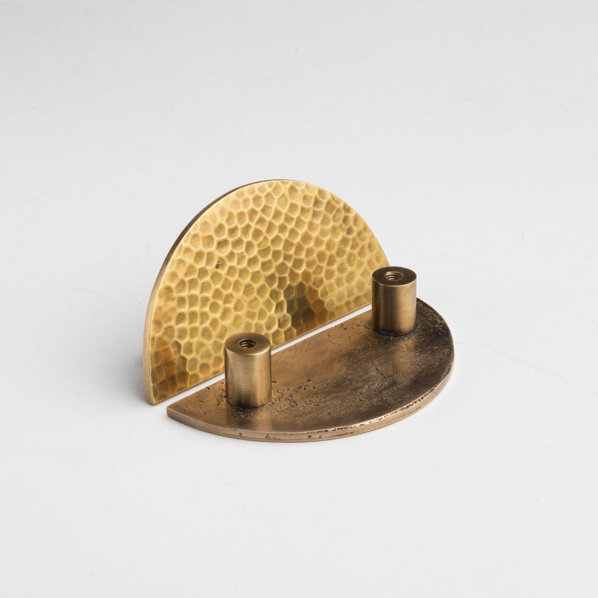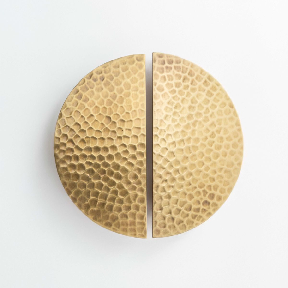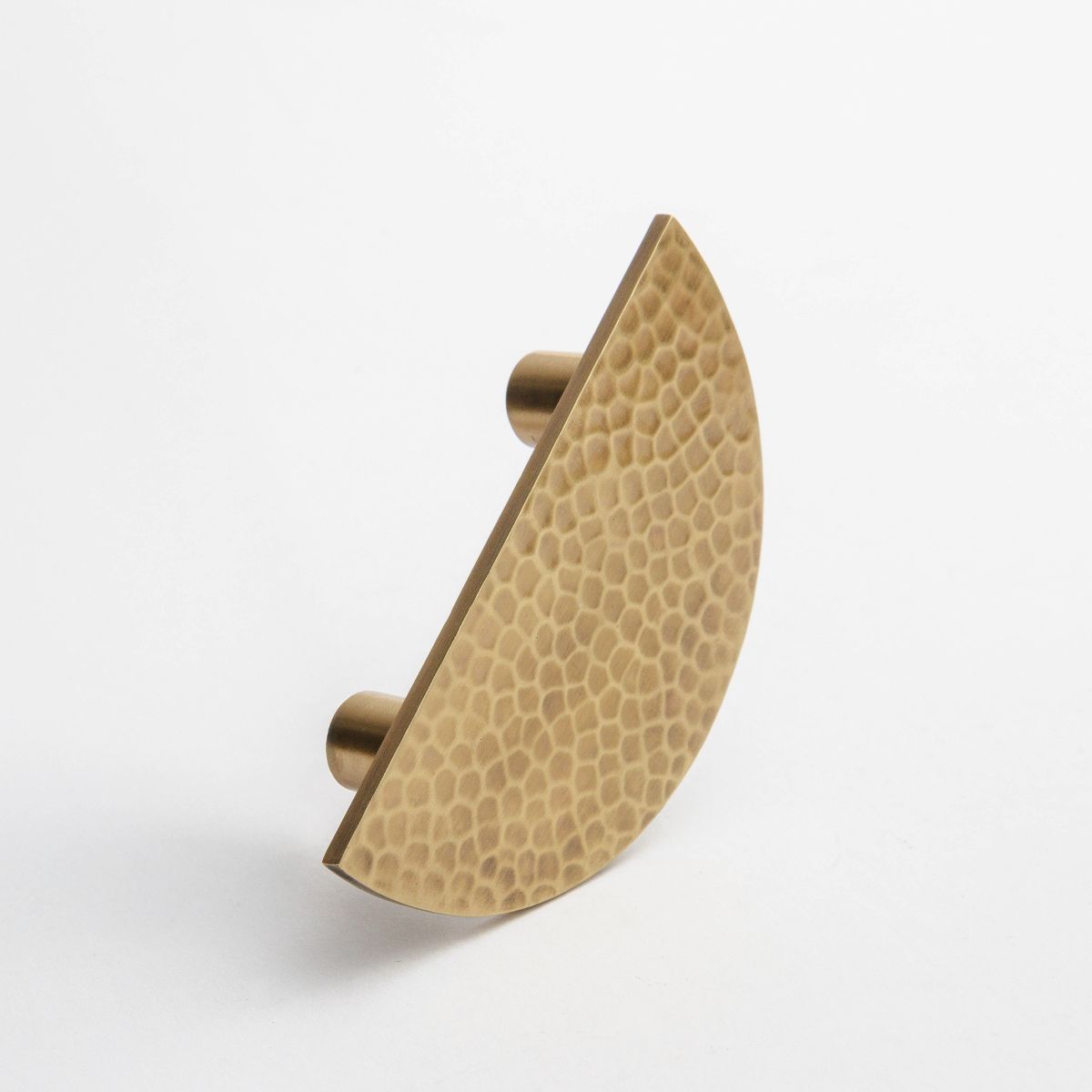 Cette poignée de meuble en laiton massif adopte une forme demi-circulaire au dessin pur, entièrement martelée à la main dans nos ateliers. Chaque coup de marteau crée une empreinte singulière, donnant naissance à une texture organique qui varie selon la lumière et le point de vue. Inspirée de l’artisanat oriental, cette finition rythmée rappelle certains décors architecturaux traditionnels, réinterprétés ici dans un esprit contemporain.
