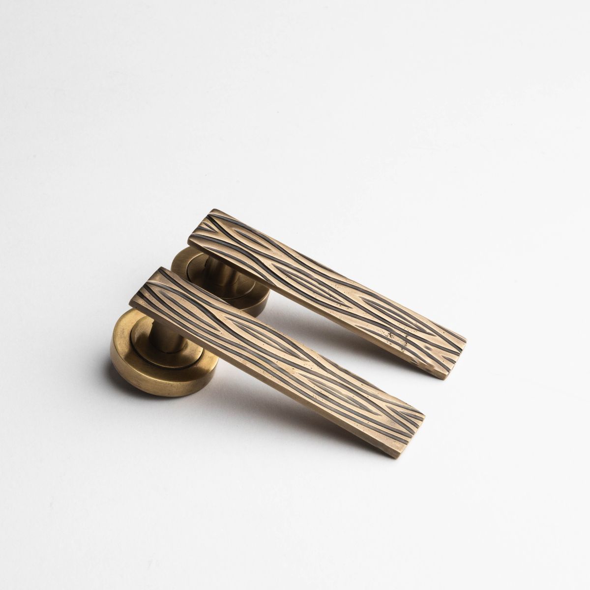 Cette poignée de porte en laiton massif se distingue par son motif gravé, inspiré des lignes naturelles du bois, des gravures de lignes asymétriques en longueur, subtilement intégrées en finition canon de fusil. Les courbes irrégulières et les creux subtils créent un jeu de lumière et d’ombre qui accentue la profondeur du design.