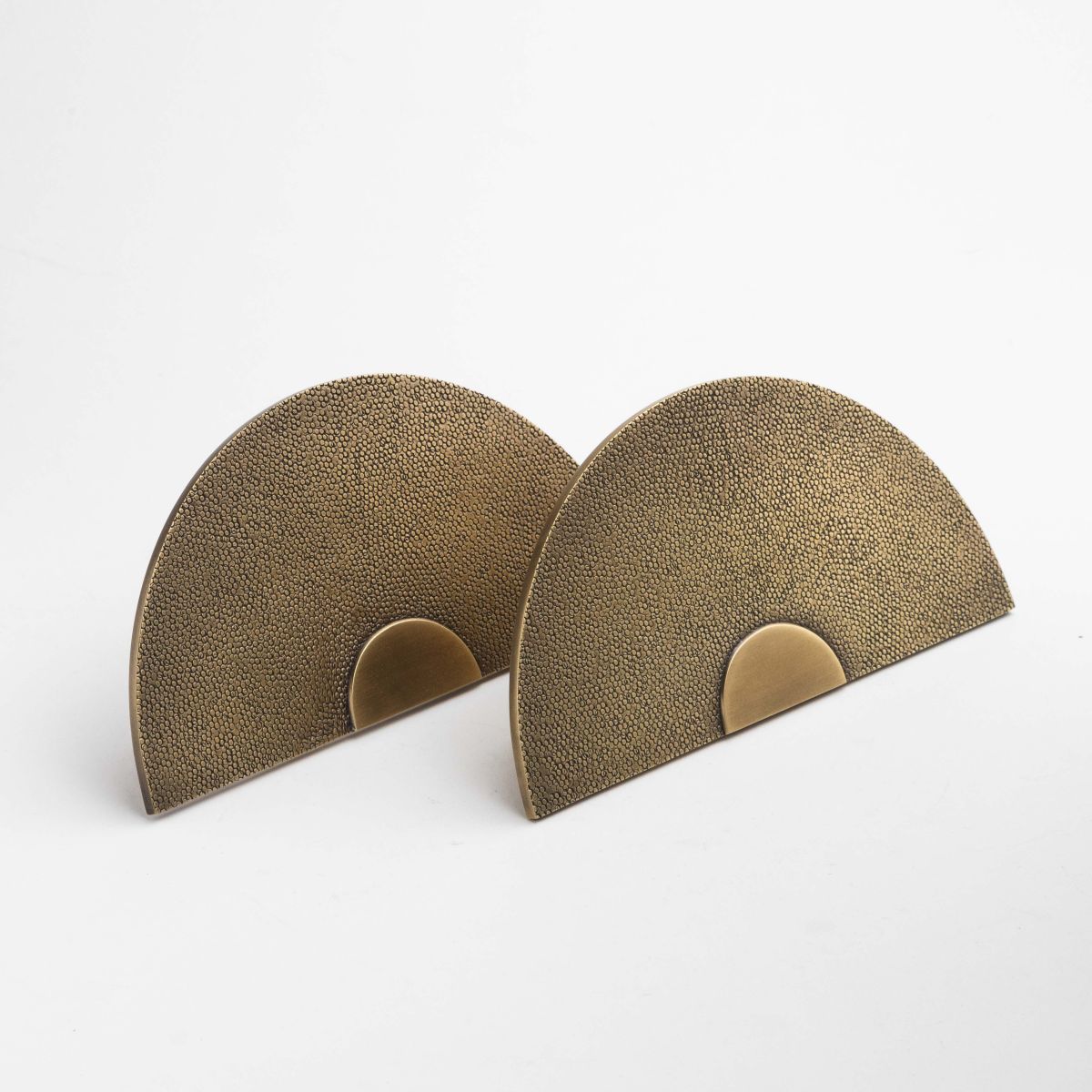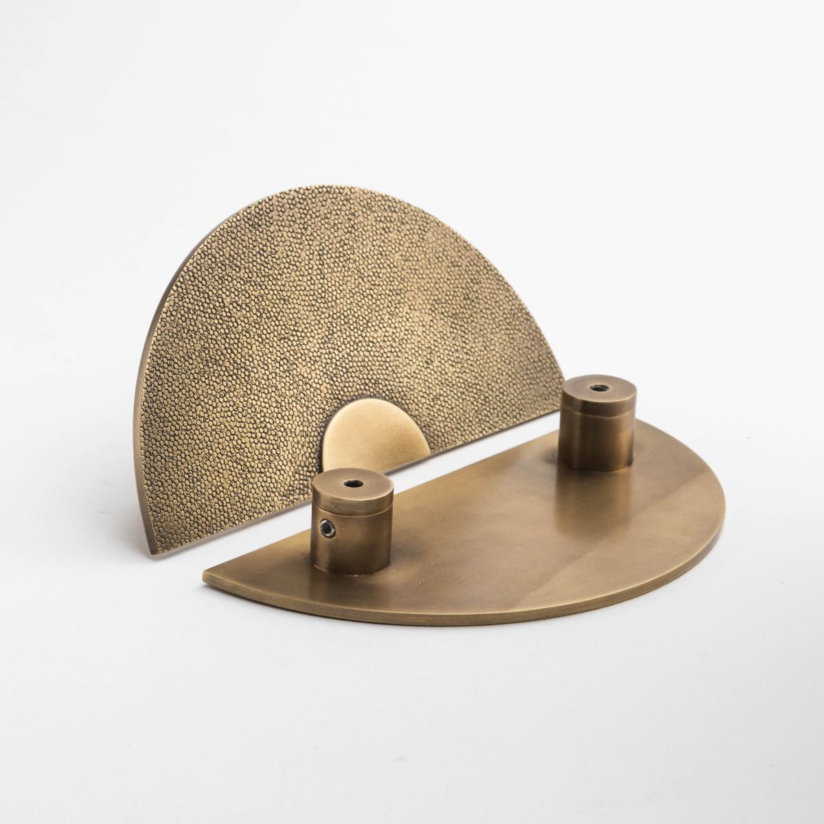 Cette poignée de tirage en laiton massif incarne l’esthétique Art Déco à travers une forme circulaire structurée par un motif martelé inspiré du galuchat. Réalisée à la main, chaque pièce révèle une texture organique qui capte subtilement la lumière.