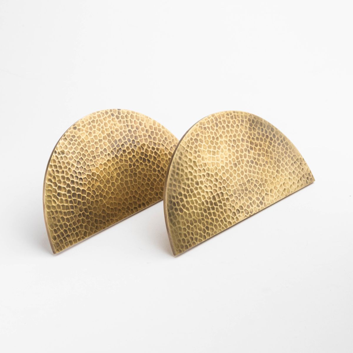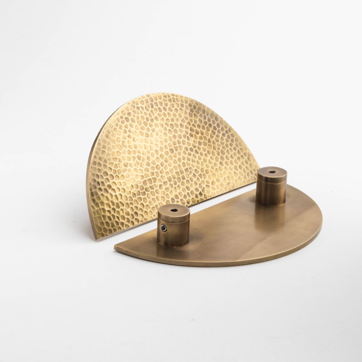 Le laiton patiné en finition or vieilli révèle des nuances chaleureuses et évolutives, accentuant le relief du motif. L’irrégularité du martelage témoigne d’un travail artisanal, rendant chaque poignée de tirage unique.