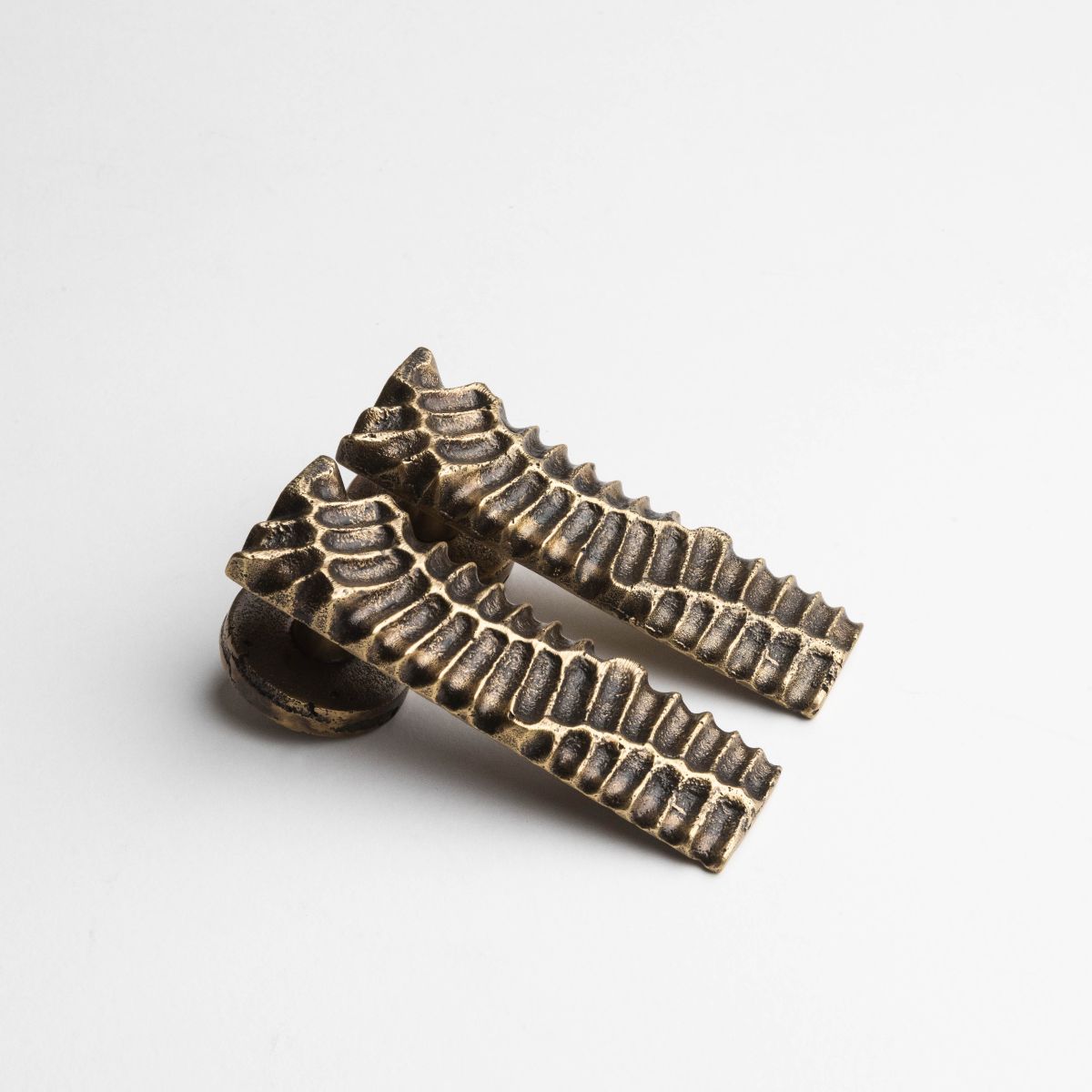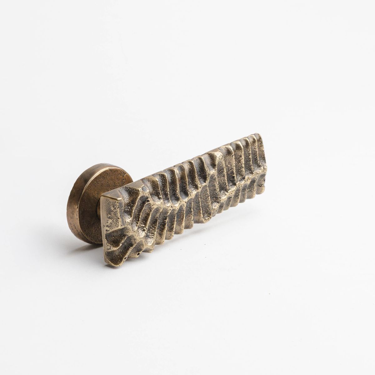 Issue de la collection Empreintes, cette poignée à béquille en laiton massif s’inspire de la nature et de ses motifs organiques irréguliers. Sa surface texturée évoque les reliefs sculptés par le temps, créant une présence visuelle unique. La patine or vieilli et noir accentue les contrastes et joue avec la lumière, soulignant les détails du design.