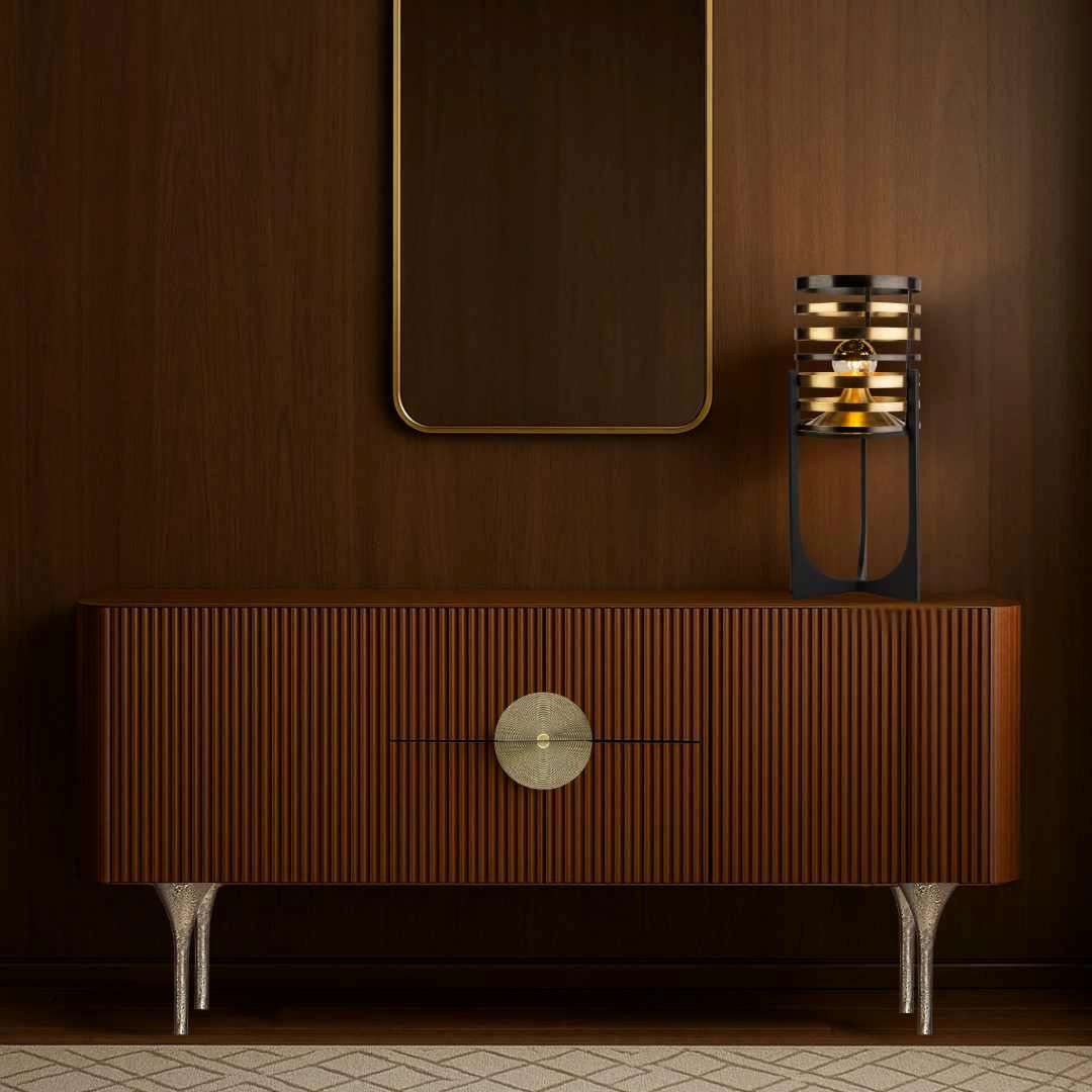 Ce buffet en chêne et laiton Gaé 1 se distingue par une silhouette allongée et une façade cannelée à lames verticales. Le rythme régulier des cannelures est interrompu au centre par une poignée en fils de laiton au motif circulaire, qui signe la composition. Les pieds en fonderie de laiton adoptent une forme élancée et légèrement évasée, apportant légèreté visuelle et stabilité.