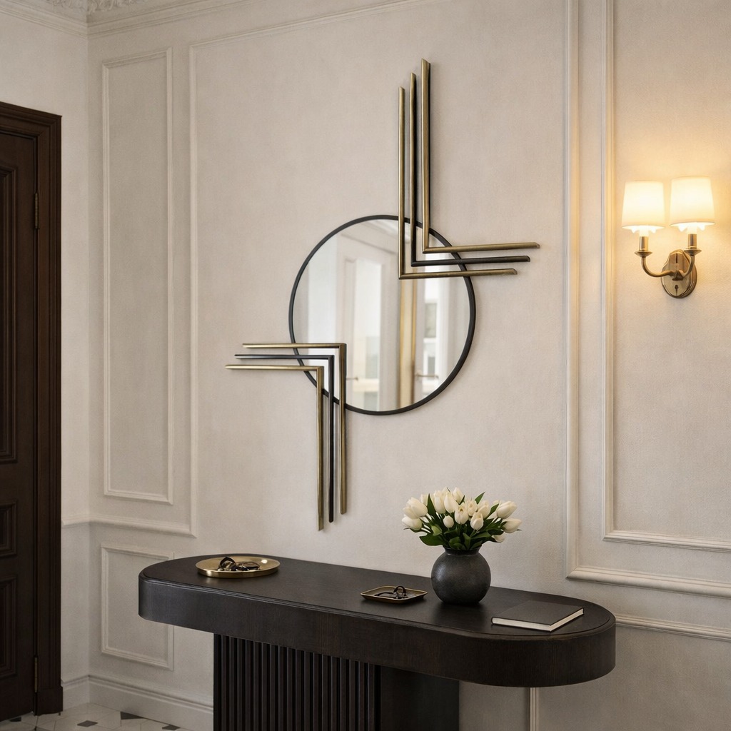 Le miroir mural Andrée 3 se distingue par une composition graphique où lignes et matières s’entrecroisent avec élégance. En son centre, un miroir rond de 80 cm de diamètre capte la lumière et apporte profondeur à l’espace. Autour de ce cercle, des motifs en « L » prolongent la structure : en haut à droite, trois lignes parallèles – deux en laiton patiné et une en acier noir – s’étirent vers l’extérieur, tandis qu’en bas à gauche, le même motif apparaît en inversion.