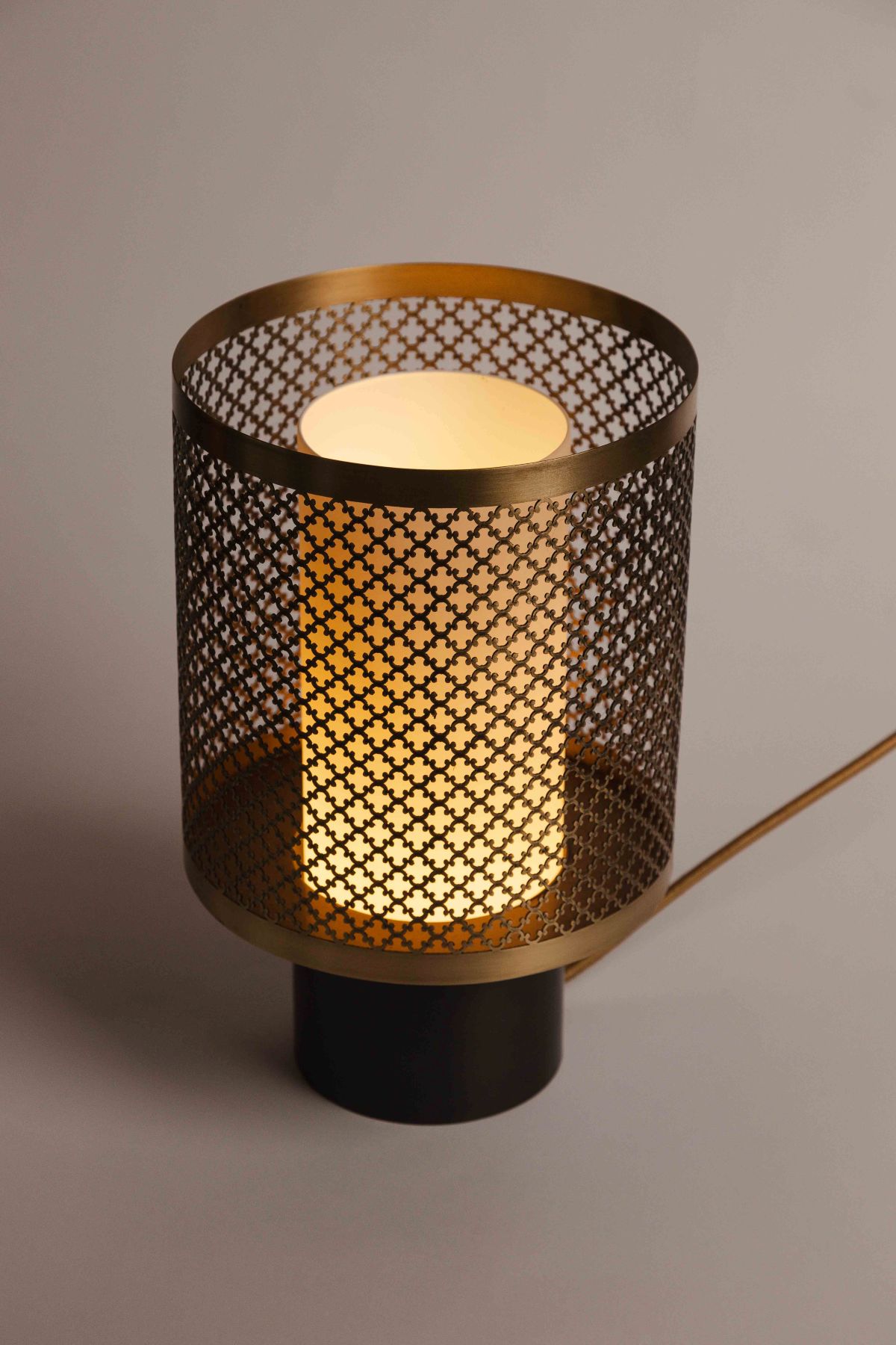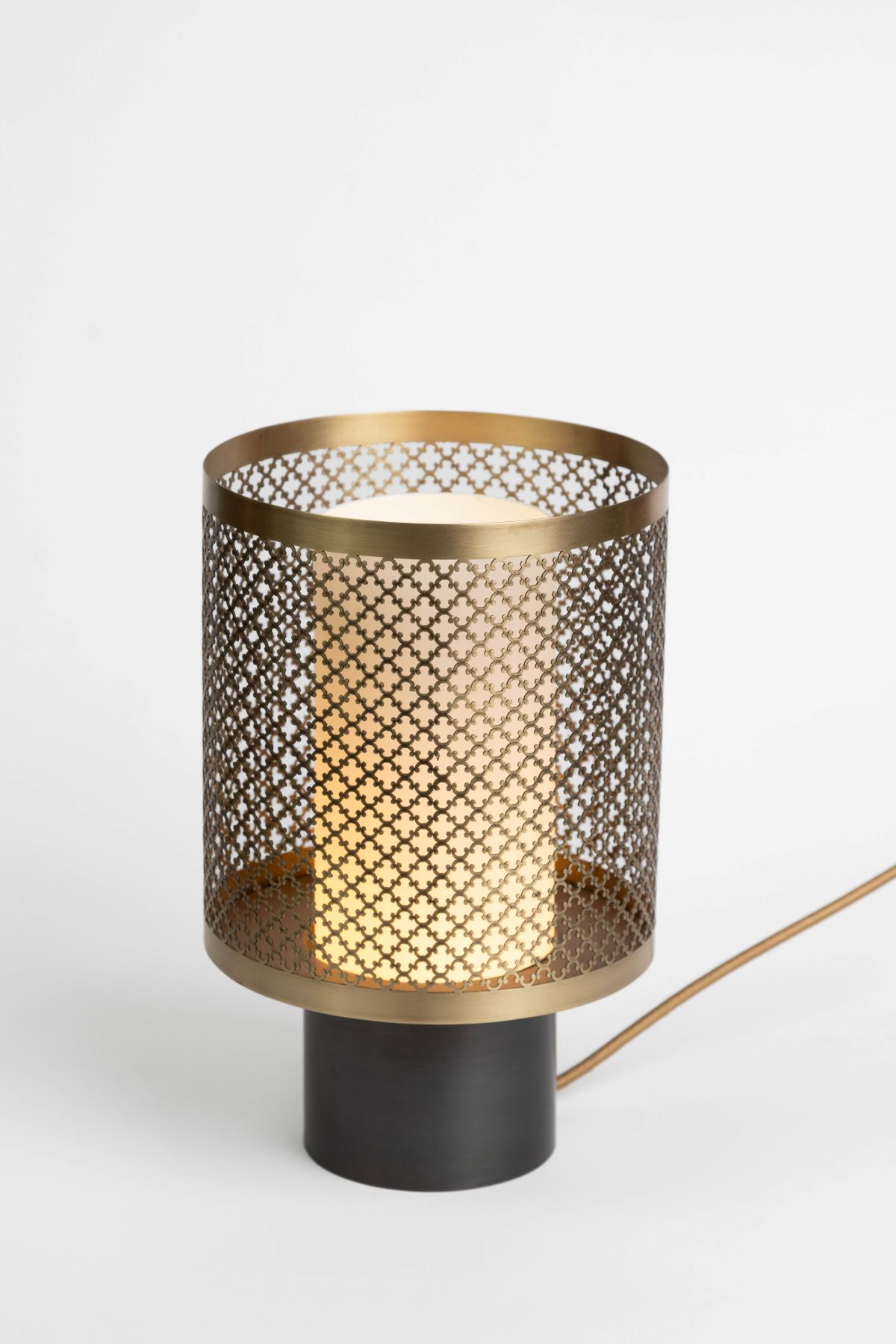 Lamp base in aged gold engraved brass and gunmetal patinated brass, opaque glass