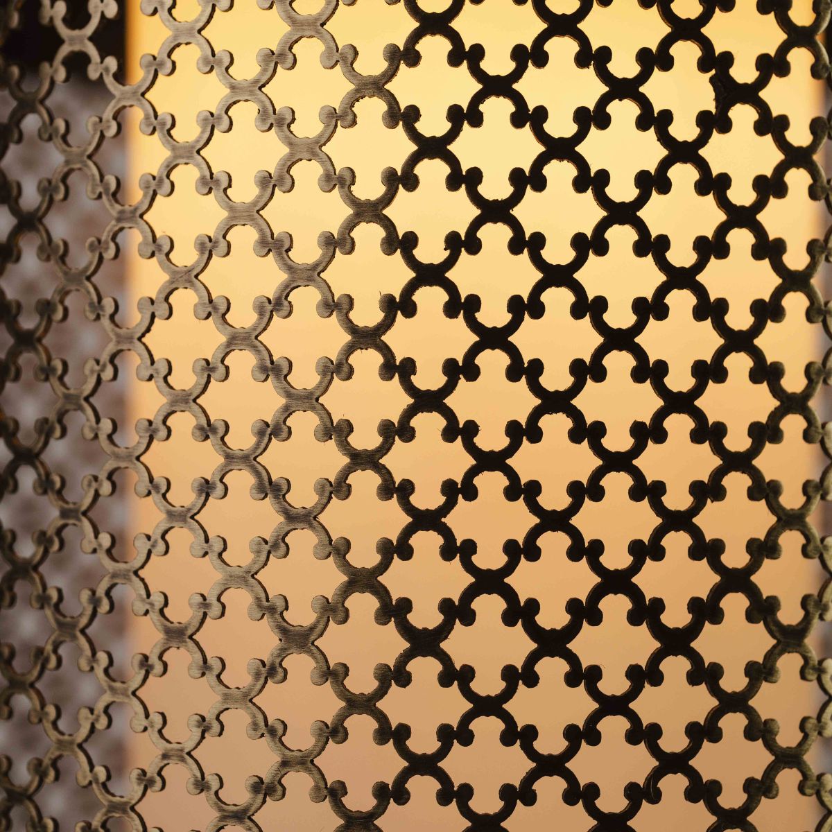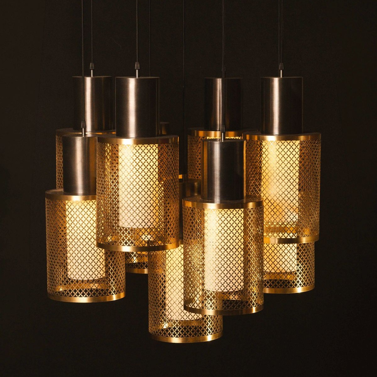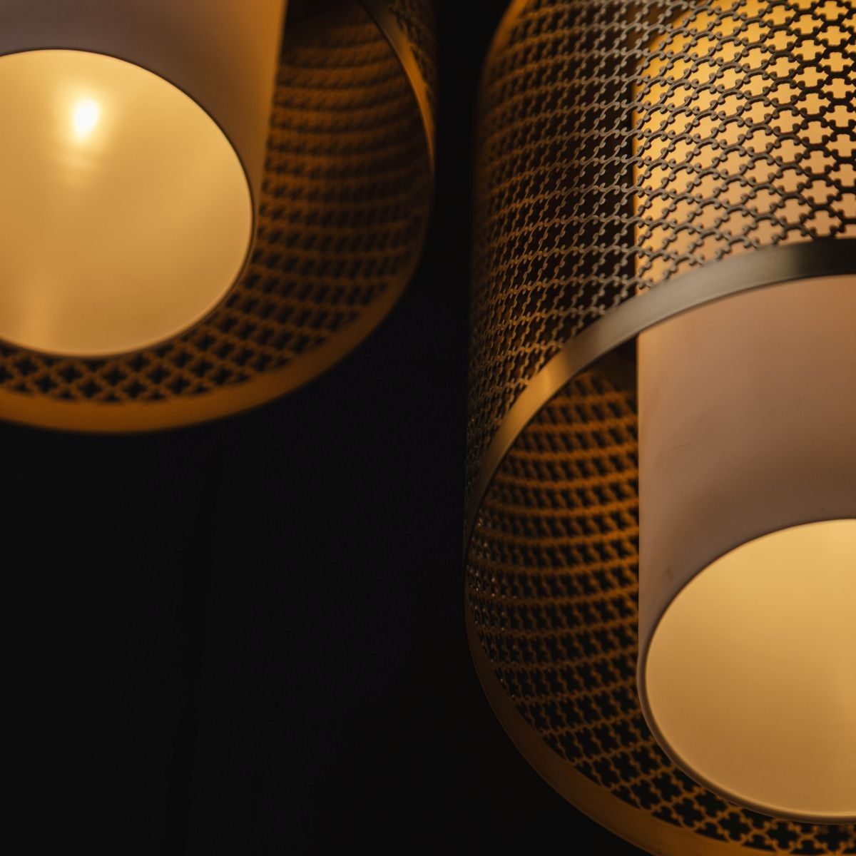 Pendant light in aged gold engraved brass and gunmetal patinated brass, opaque glass.