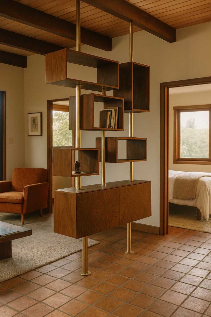 The niches, arranged with precision, offer multiple possibilities for display. They can hold books, decorative objects, or art pieces, creating a dynamic visual composition. In the lower section, two closed modules feature brass-engraved fronts, adding an artistic and sophisticated dimension to the whole.