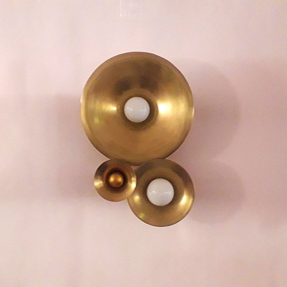 Gaé Trio is a round brass wall light fixture composed of three overlapping discs in aged gold patinated brass. Arranged in an asymmetrical cluster, the design evokes a bouquet of cymbals in a refined, geometric composition.