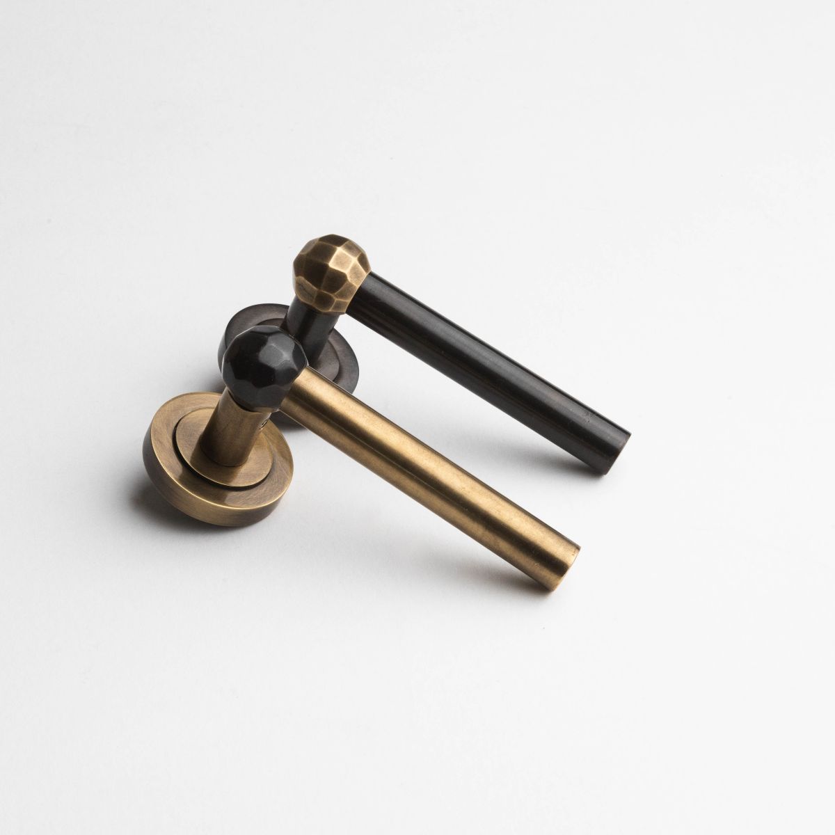 Gun barrel patinated brass and hammered brass door handle. These are handmade items, please allow some tolerance on dimensions and patina.