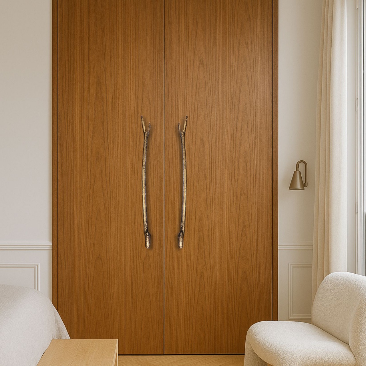 This front door pull handle in solid brass captures the essence of nature through a refined, organic design. Its slender silhouette, inspired by the shape of a branch, expresses the fluidity and balance that define the Earth Prints collection. The surface reveals subtle textures shaped by the artisan’s hand, allowing light to glide across the metal with natural grace. As a result, the handle creates an elegant rhythm on the door while blending seamlessly with both contemporary and classic interiors.