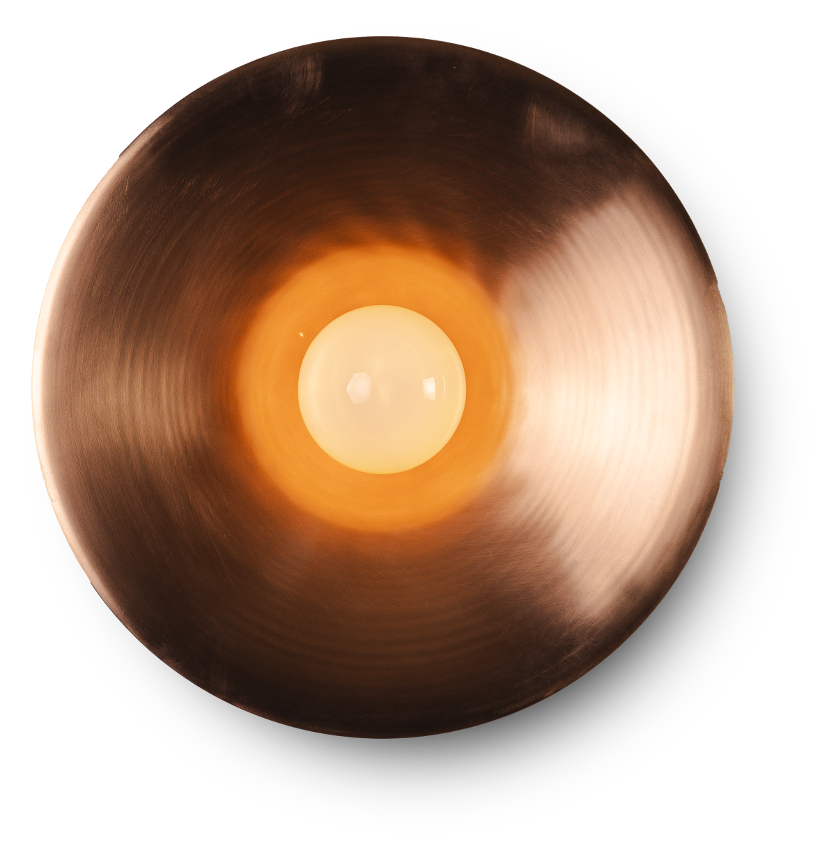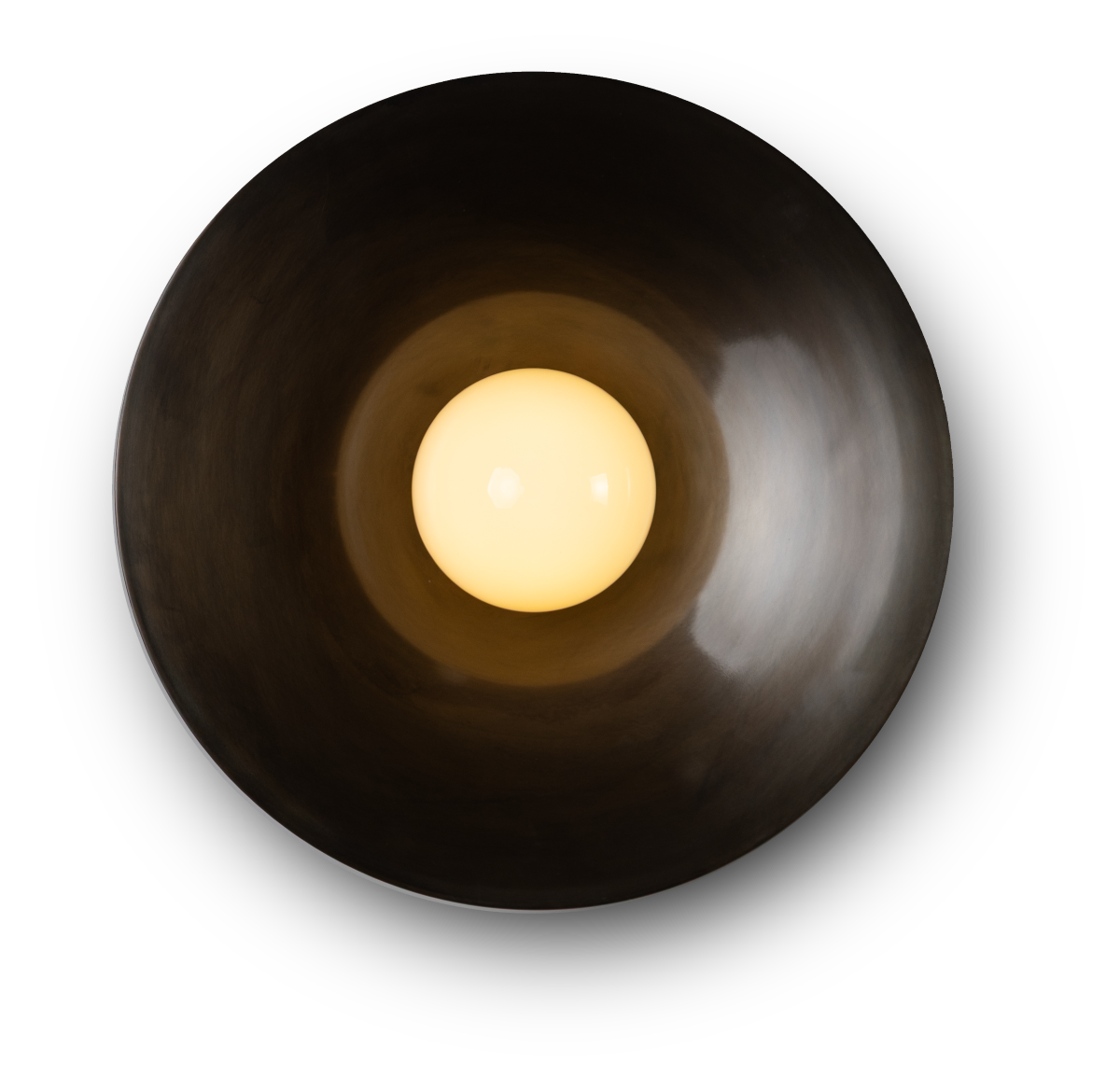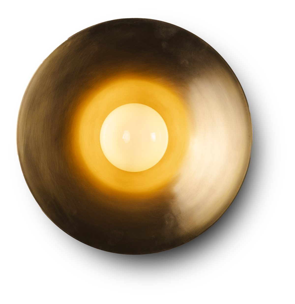 Wall sconce in green grey patina brass, aged gold, gunmetal, and copper.