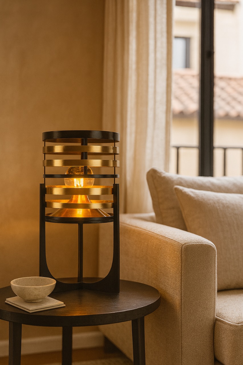 The shade is composed of alternating rings of golden brass and gunmetal. This visual rhythm creates a sense of transparency, filtering the light with elegance. Inside, a cymbal-shaped reflector in aged brass holds a golden-tipped bulb. Together, they diffuse a warm and gentle glow, projecting subtle reflections that enrich the atmosphere.